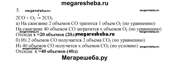 5. Сожгли 40 л угарного газа СО. Вычислите: а) объем вступившего в реакцию кислорода; б) объем образовавшегося оксида углерода(lV).