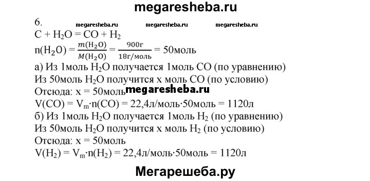6. Раскаленный уголь реагирует с парами воды: С + Н2O = СОÎ + Н2Î. Вычислите общий объем полученных газов, если в реакцию с углем вступило 900 г воды.