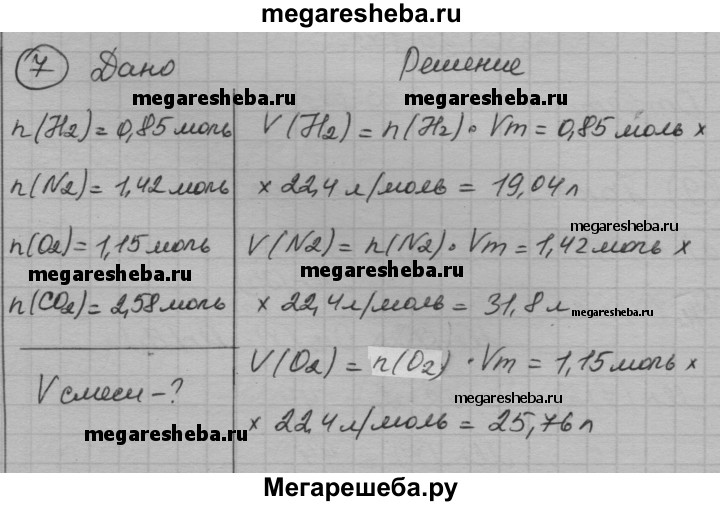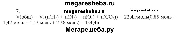 7. Какой объем займет смесь газов следующего количественного состава: 0,85 моль водорода, 1,42 моль азота N2, 1,15 моль кислорода, 2,58 моль углекислого газа СO2?