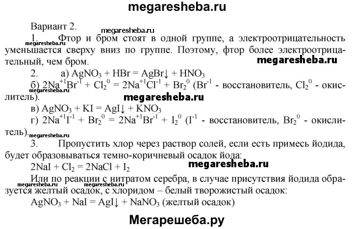 Вариант 2 1. На основе положения элементов в периодической таблице укажите, какой из галогенов — фтор или бром обладает большей электроотрицательностью. Ответ обоснуйте. 2. Напишите уравнения реакций: а) между нитратом серебра и бромоводородной кислотой НВг; б) между бромидом натрия и хлором; в) между иодидом калия и нитратом серебра; г) между иодидом натрия и бромом. В уравнениях реакций б и г укажите степени окисления атомов, а также окислитель и восстановитель. 3. Как можно экспериментально обнаружить примесь иодида натрия в хлориде натрия? Ответ подтвердите уравнением реакции.