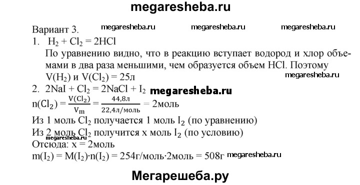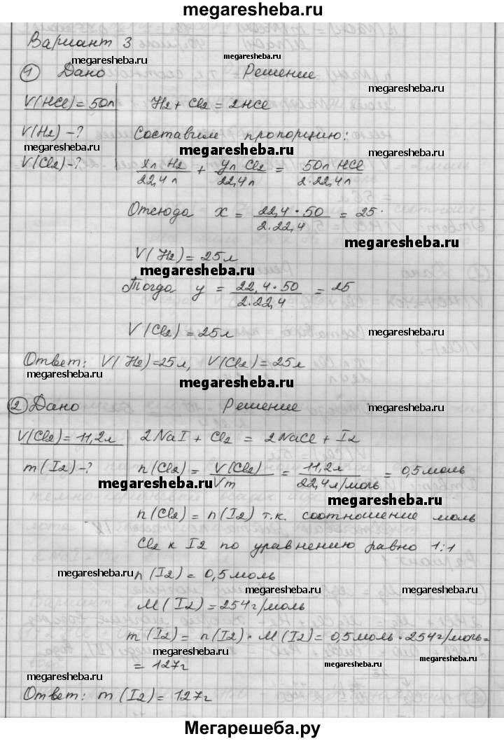 Вариант 3 1. Рассчитайте, какие объемы водорода и хлора израсходуются для синтеза хлороводорода объемом 50 л. 2. Через раствор иодида натрия пропустили 11,2 л хлора (н. у.). Рассчитайте массу иода, выделившегося при этом.