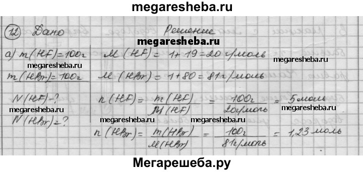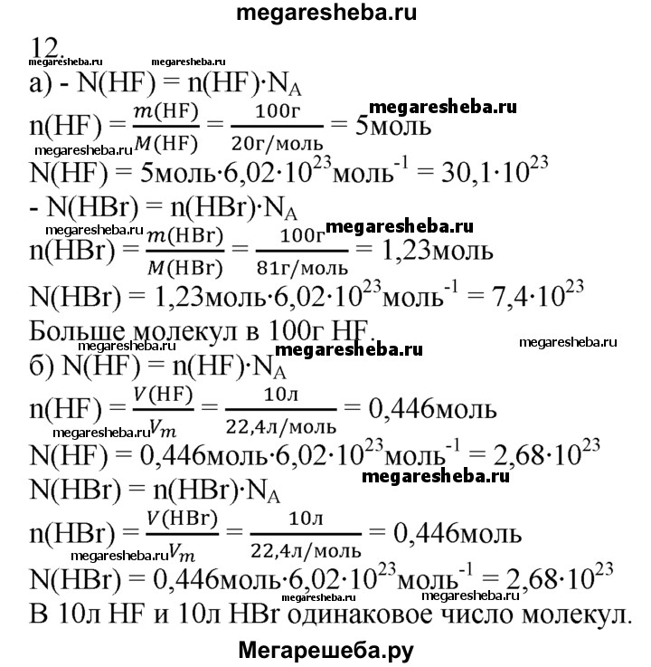 12. Одинаково ли число молекул: а) в 100 г фтороводорода и 100 г бромоводорода; б) в 10 л фтороводорода и 10 л бромоводорода? Дайте обоснованный ответ.