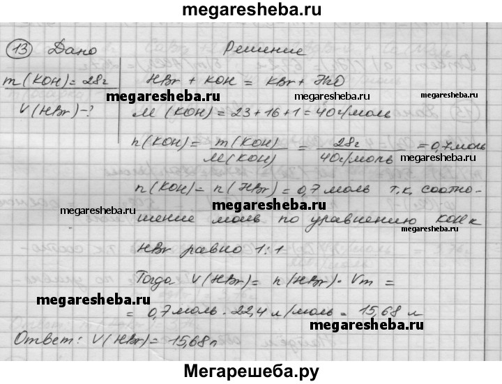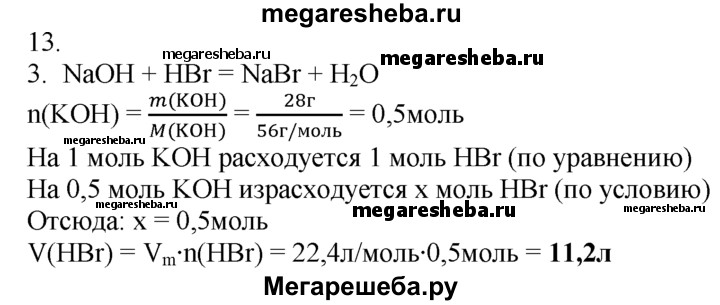 13. Какой объем бромоводорода (н. у.) потребуется для нейтрализации раствора, содержащего 28 г гидроксида калия?