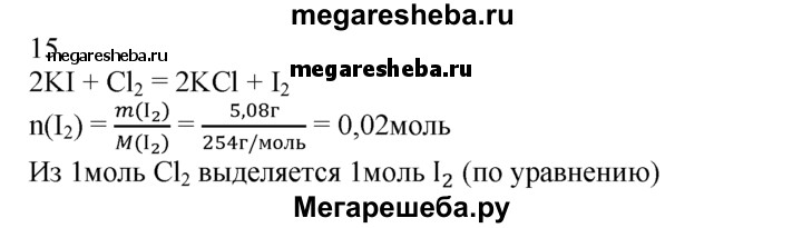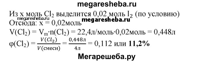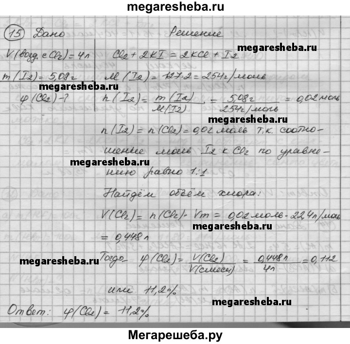 15. Через склянку с раствором иодида калия пропустили 4 л воздуха (н. у.), содержащего хлор. При этом выделилось 5,08 г иода. Какова объемная доля хлора в воздухе?