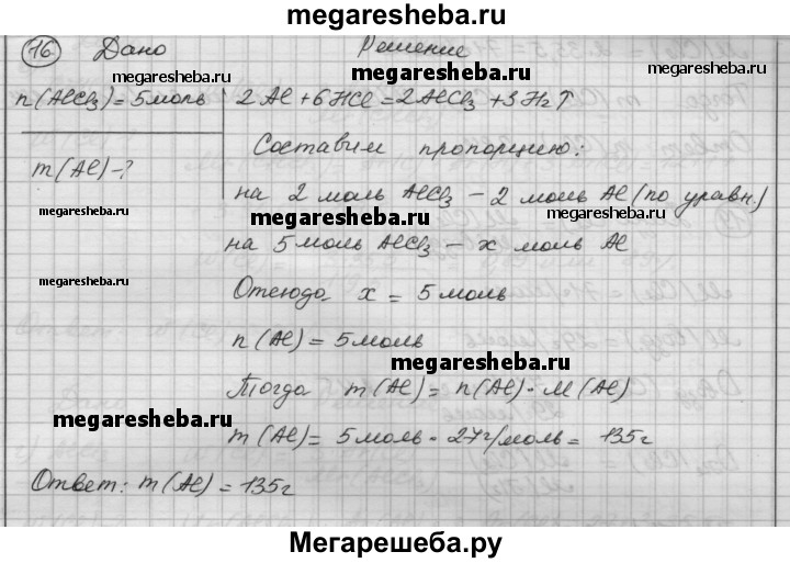 16. Рассчитайте массу алюминия, который должен вступить в реакцию с соляной кислотой, чтобы образовалось 5 моль хлорида алюминия.