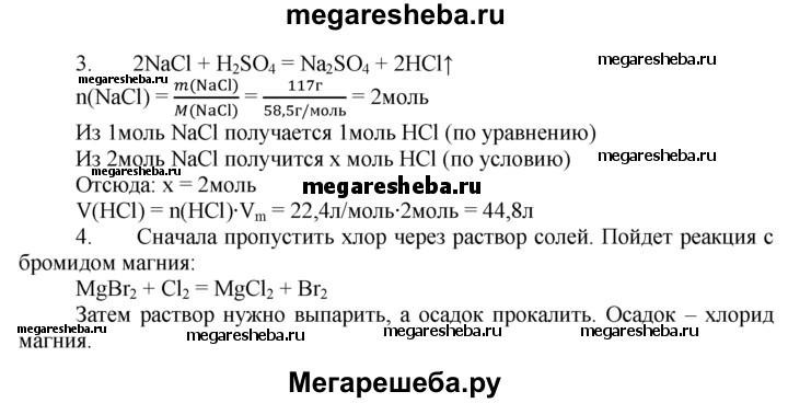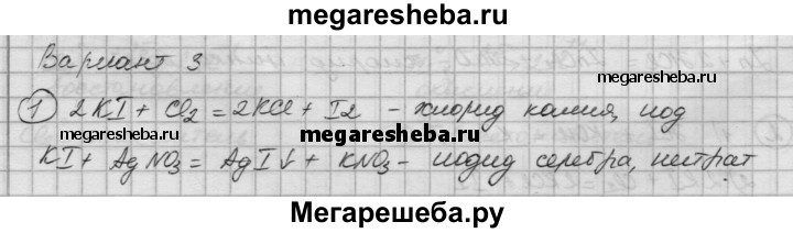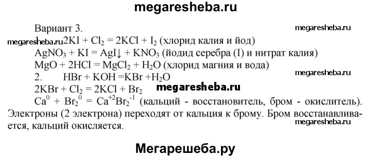 Вариант 3 1. Между какими из перечисленных веществ возможны химические реакции: иодид калия, хлор, соляная кислота, нитрат серебра? Напишите уравнения осуществимых реакций и назовите образующиеся вещества. 2. Напишите уравнения реакций, с помощью которых можно осуществить следующие превращения: НВr 1—> КВr 2—> Вr2 3 —> СаВr2 Реакцию 3 разберите как окислительно-восстановительную: обозначьте степени окисления атомов, стрелкой укажите переход электронов, а также окислитель и восстановитель. 3. Рассчитайте объем хлороводорода (н. у.), полученного при взаимодействии 117 г хлорида натрия с концентрированной серной кислотой. 4. Как освободить хлорид магния от примеси бромида магния? Опишите ход опыта и составьте необходимое уравнение реакции.