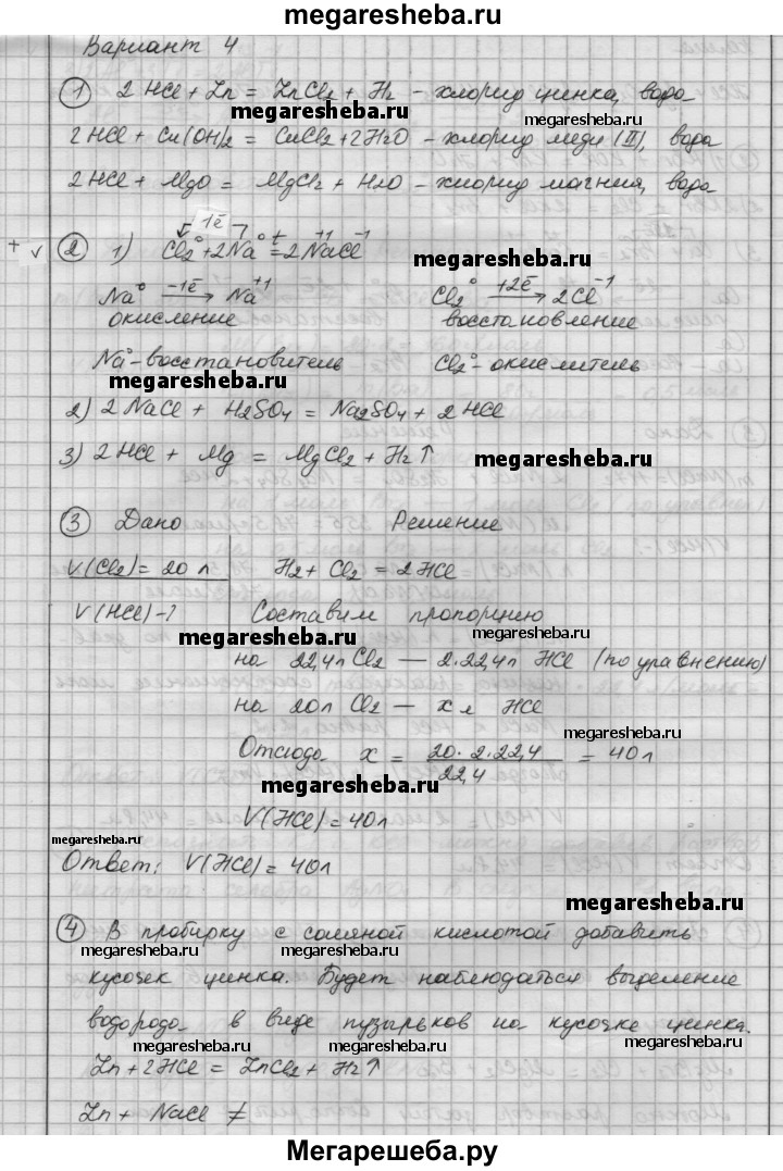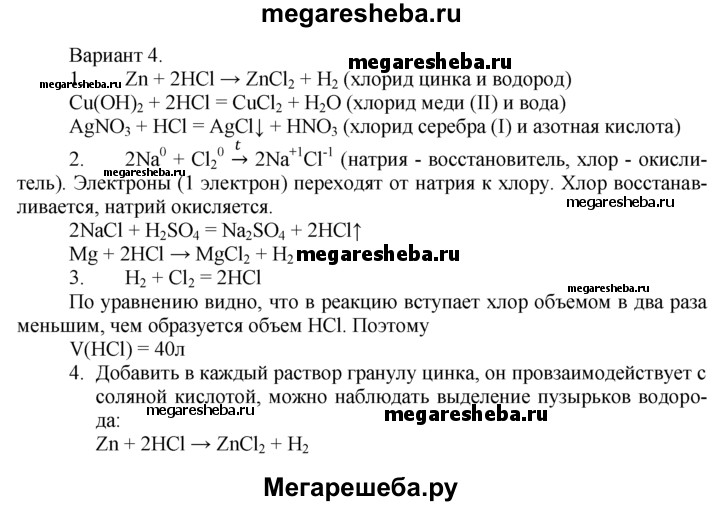 Вариант 4 1. С какими из перечисленных веществ будет реагировать соляная кислота: цинк, гидроксид меди(ll), оксид магния, серебро? Напишите уравнения осуществимых реакций и назовите образующиеся вещества. 2. Напишите уравнения реакций, с помощью которых можно осуществить следующие превращения: Cl2 1-> NaCl 2-> HCl 3-> MgCl2 Реакцию 1 разберите как окислительно-восстановительную: обозначьте степени окисления атомов, стрелкой укажите переход электронов, а также окислитель и восстановитель. 3. Рассчитайте объем хлороводорода (н. у.), образующегося при взаимодействии 20 л хлора с водородом. 4. В одной из пробирок находится раствор хлорида натрия, а в другой — соляная кислота. Как их можно распознать, не пользуясь индикатором? Ответ подтвердите соответствующими уравнениями реакций.