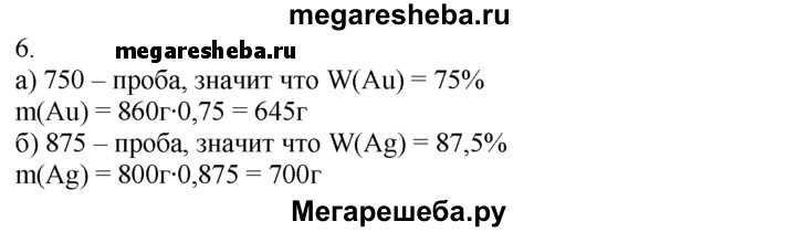 6. В чистом виде золото и серебро — мягкие металлы. Для повышения механической прочности их сплавляют с медью. Число частей золота или серебра, приходящееся на 1000 частей сплава, называют пробой. Рассчитайте массу: а) золота в сплаве 750-й пробы массой 860 г; б) серебра в сплаве 875-й пробы массой 800 г.