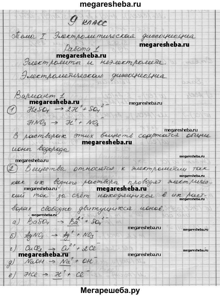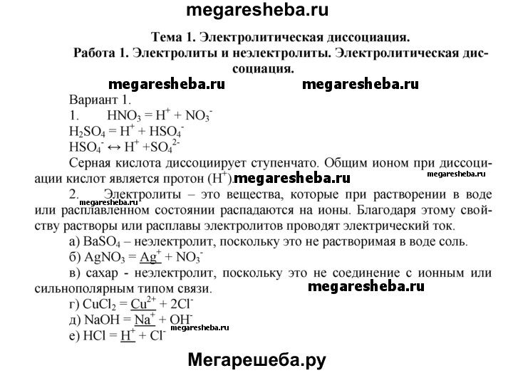 Вариант 1 1. Напишите уравнения электролитической диссоциации серной и азотной кислот. Какие общие ионы содержатся в растворах этих веществ? 2. Даны вещества, формулы которых: a) BaSO4; б) AgNO3; в) С12Н22О11 (сахар); г) СuСl2; д) NaOH; е) НСl. Выпишите только формулы электролитов и поясните, почему эти вещества относят к электролитам. Напишите уравнения их диссоциации и подчеркните катионы.