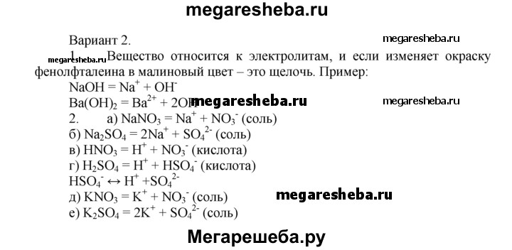 Вариант 2 1. К какому классу неорганических соединений относят вещество, если его водный раствор хорошо проводит электрический ток и изменяет окраску индикатора фенолфталеина в малиновый цвет? Напишите формулы двух таких веществ и составьте уравнения их диссоциации. 2. В растворе обнаружены следующие ионы: Na^+, NO3^-, Н^+, SO4^2- , К^+. При растворении каких веществ могли образоваться такие ионы? Напишите формулы этих веществ и уравнения их диссоциации. Назовите классы неорганических соединений, к которым относят эти вещества.