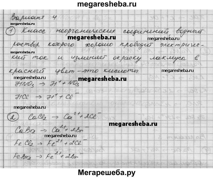 Вариант 4 1. К какому классу неорганических соединений относят вещество, если его водный раствор хорошо проводит электрический ток и изменяет окраску индикатора лакмуса в красный цвет? Напишите формулы двух таких веществ и составьте уравнения их диссоциации. 2. В воде одного источника были обнаружены следующие ионы: Са^2+, Fe^2+, Сl^-, Вг^1. При растворении каких солей в дистиллированной воде можно получить раствор, содержащий те же ионы? Напишите формулы этих солей и уравнения их диссоциации.
