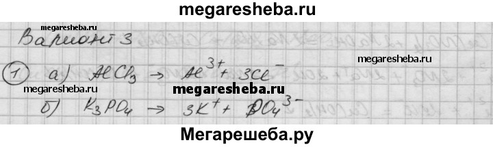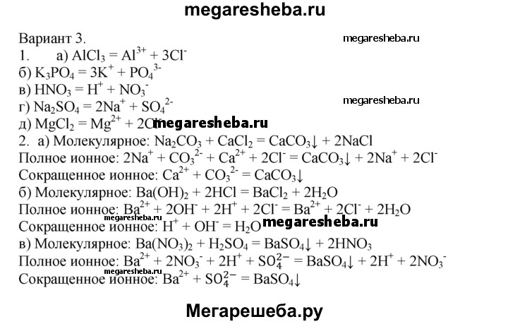 Вариант 3 1. Напишите уравнения электролитической диссоциации: а) хлорида алюминия; б) фосфата калия; в) азотной кислоты; г) сульфата натрия; д) хлорида магния. 2. Напишите молекулярные и ионные уравнения реакций между растворами: а) карбоната натрия и хлорида кальция; б) гидроксида бария и соляной кислоты; в) серной кислоты и нитрата бария.