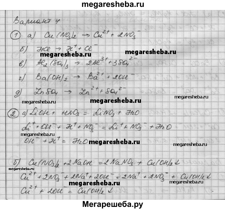 Вариант 4 1. Напишите уравнения электролитической диссоциации: а) нитрата меди(ll); б) соляной кислоты; в) сульфата алюминия; г) гидроксида бария; д) сульфата цинка. 2. Напишите молекулярные и ионные уравнения реакций между растворами: а) гидроксида лития и азотной кислоты; б) нитрата меди(ll) и гидроксида натрия; в) карбоната калия и фосфорной кислоты.
