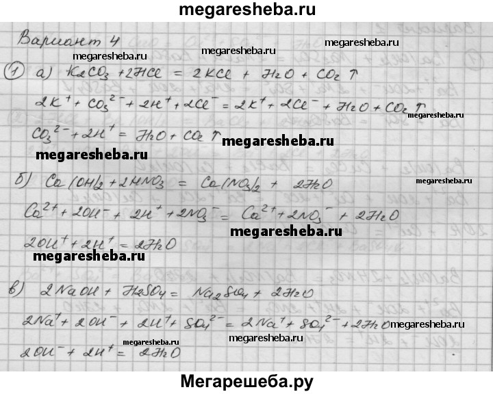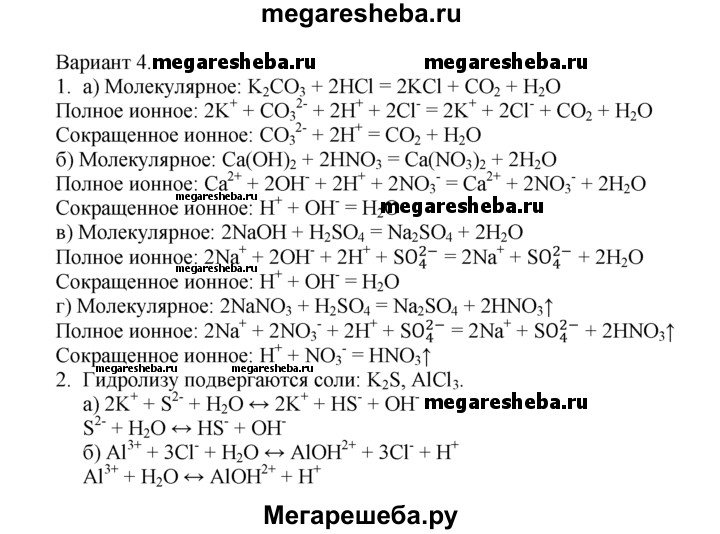 Вариант 4 1. Укажите, при взаимодействии растворов каких веществ одним из продуктов реакции является вода: а) К2СO3 и НСl; б) Са(ОН)2 и HNO3; в) NaOH и H2SO4; г) NaNO3 и H2SO4. Напишите уравнения реакций в молекулярной и ионной формах. 2. Укажите, какие из перечисленных солей подвергаются гидролизу при растворении в воде: хлорид алюминия, сульфид калия, хлорид натрия.