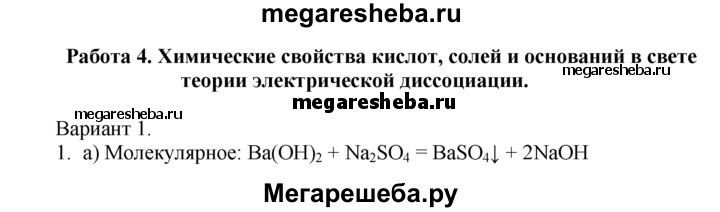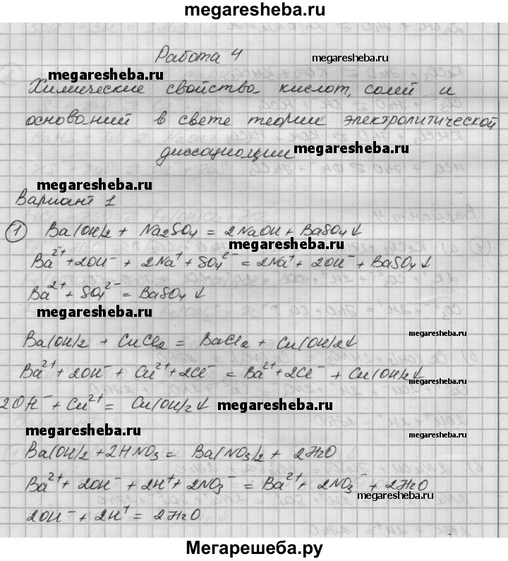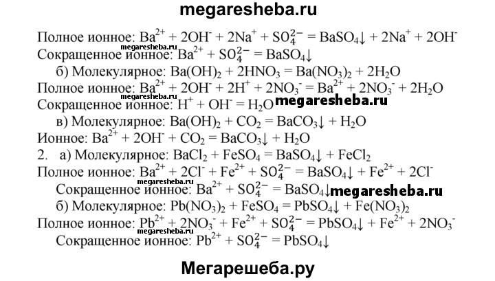 Вариант 1 1. С какими из перечисленных веществ будет реагировать раствор гидроксида бария: сульфат натрия, оксид железа(ll), хлорид меди(ll), азотная кислота, гидроксид калия, оксид углерода(lV)? Напишите молекулярные и ионные уравнения возможных реакций. 2. Как, исходя из сульфата железа(ll), получить: а) хлорид железа; б) нитрат железа(ll)? Напишите молекулярные и сокращенные ионные уравнения реакций.