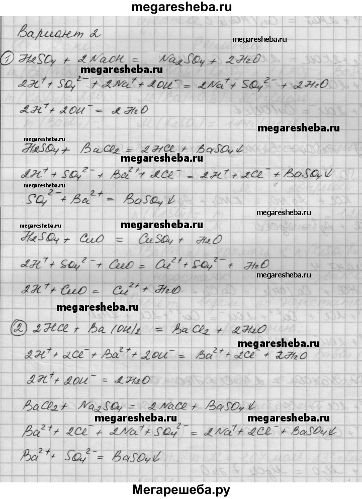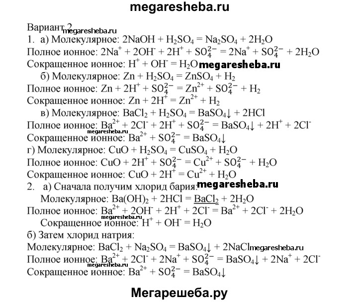 Вариант 2 1. С какими из перечисленных веществ будет реагировать разбавленная серная кислота: ртуть, гидроксид натрия, цинк, хлорид бария, золото, оксид меди(ll)? Напишите молекулярные и ионные уравнения возможных реакций. 2. Как, имея в своем распоряжении сульфат натрия, соляную кислоту и гидроксид бария, можно получить хлорид натрия? Напишите молекулярные и сокращенные ионные уравнения реакций.