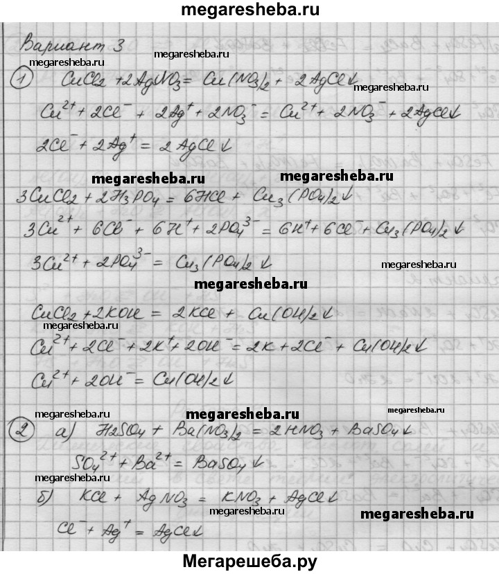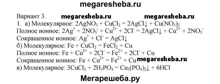 Вариант 3 1. С какими из перечисленных веществ будет реагировать раствор хлорида меди(ll): нитрат серебра, хлорид натрия, железо, фосфорная кислота, оксид цинка, гидроксид калия? Напишите молекулярные и ионные уравнения возможных реакций. 2. Укажите, как можно: а) очистить азотную кислоту от примеси серной кислоты; б) превратить хлорид калия в нитрат калия. Напишите молекулярные и сокращенные ионные уравнения реакций.