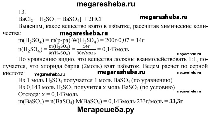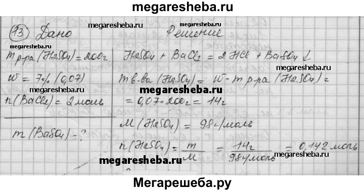 13. Рассчитайте массу сульфата бария, образующегося при взаимодействии 200 г 7%-ного раствора серной кислоты с раствором хлорида бария, содержащим 2 моль этой соли.
