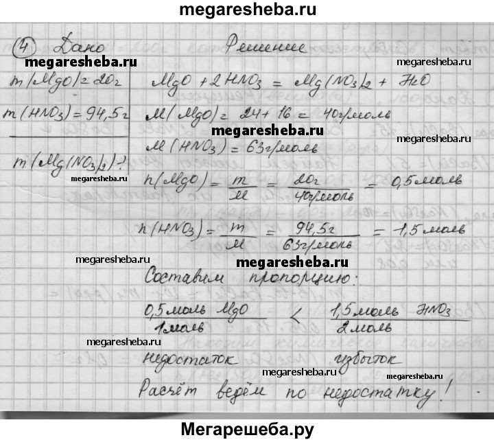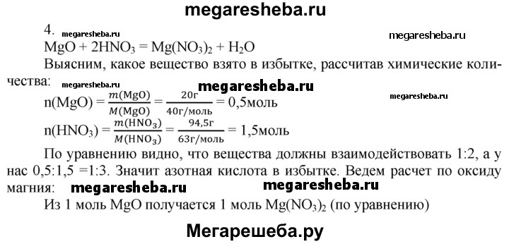4. Рассчитайте массу нитрата магния, образующегося при взаимодействии 20 г оксида магния с раствором, содержащим 94.5 г азотной кислоты.