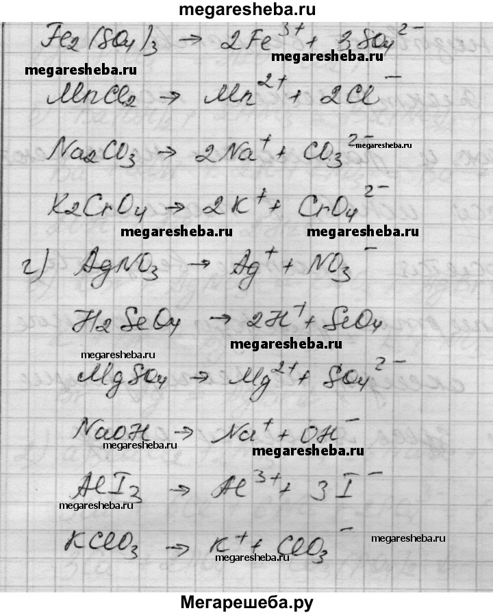 4. Напишите уравнения электролитической диссоциации следующих веществ: а) MgBr, НСlO4, LiOH, Pb(NO3)2, CuSO4, K2Cr2O7 б) H2SO3, Ba(OH)2, ZnCl2, K2S, Na3PO4, KMnO4 в) KOH, НIO3, Fe2(SO4)3, MnCl2, Na2CO3, К2ClO4 r) AgNO3, H2SeO4, MgSO4, NaOH, AIl3, KClO3