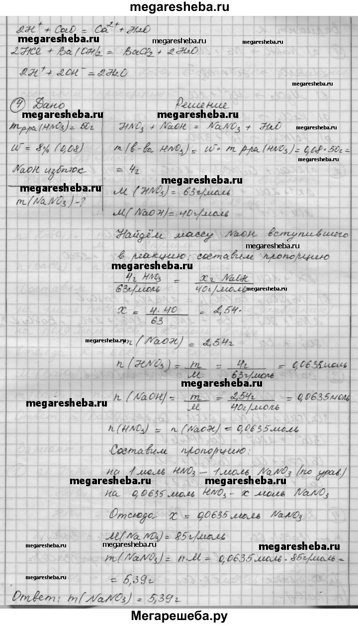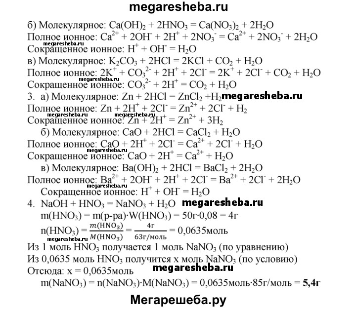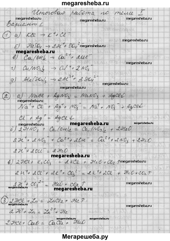 Вариант 1 1. Напишите уравнения электролитической диссоциации: а) хлорида калия; б) серной кислоты; в) гидроксида кальция; г) нитрата меди(ll); д) сульфата алюминия. 2. Напишите молекулярные и ионные уравнения реакций, протекающих при сливании растворов: а) хлорида натрия и нитрата серебра; б) азотной кислоты и гидроксида кальция; в) соляной кислоты и карбоната калия. 3. Укажите, с какими из перечисленных веществ будет реагировать соляная кислота: цинк, оксид кальция, ртуть, гидроксид бария, нитрат натрия. Напишите молекулярные и сокращенные ионные уравнения возможных реакций. 4. К 50 г 8%-ного раствора азотной кислоты прилили избыток раствора гидроксида натрия. Рассчитайте массу образовавшейся соли.