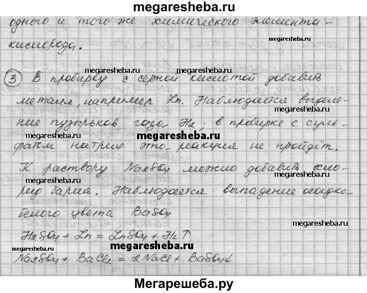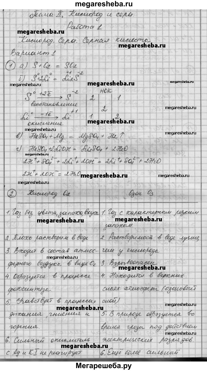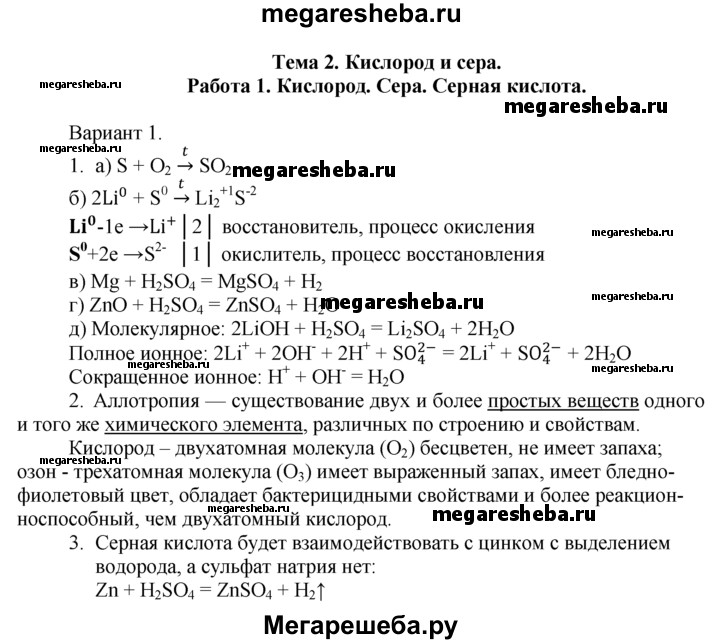 Вариант 1 1. Составьте уравнения реакций: а) серы с кислородом; б) серы с литием (укажите степени окисления атомов и расставьте коэффициенты с помощью метода электронного баланса); в) раствора серной кислоты с магнием; г) раствора серной кислоты с оксидом цинка; д) раствора серной кислоты с раствором гидроксида лития (в молекулярной и ионной формах). 2. Сравните состав молекул и свойства кислорода и озона. Поясните сущность аллотропии. 3. В одной пробирке находится раствор сульфата натрия, а в другой — раствор серной кислоты. Как можно распознать эти растворы, не используя индикатор? Напишите уравнения соответствующих реакций.