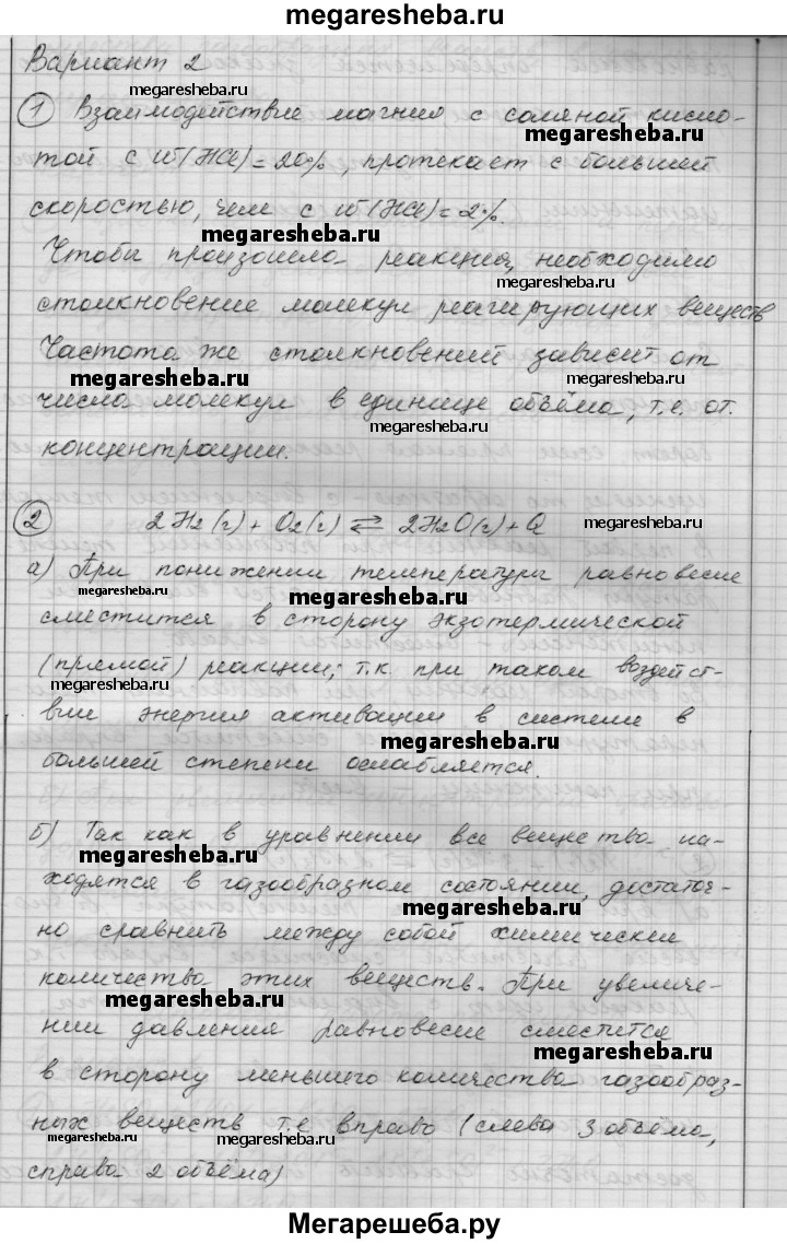 Вариант 2 1. Охарактеризуйте на конкретных примерах зависимость скорости химических реакций от концентрации реагирующих веществ. 2. В какую сторону сместится равновесие реакции а) при понижении температуры; б) при увеличении давления? Дайте обоснованный ответ.