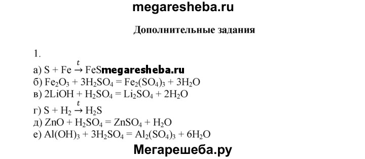 1. По приведенным схемам составьте уравнения химических реакций: а) Fe + S —> б) Н2SO4 + Fe2O3 —> в) H2SO4 + LiOH —> г) Н2 + S —> д) H2SO4 + ZnO —> e) H2SO4 + Al(OH)3 —>