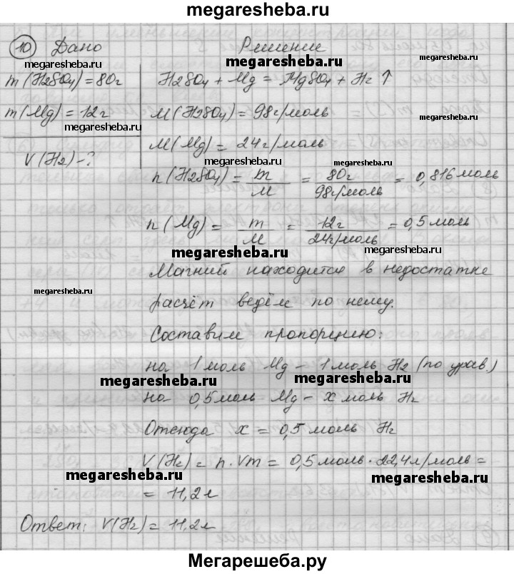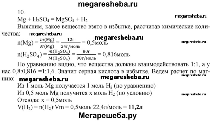 10. В раствор, содержащий 80 г серной кислоты, поместили 12 г магния. Вычислите объем выделившегося газа (н. у.).