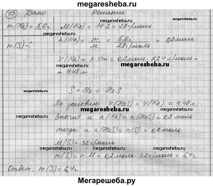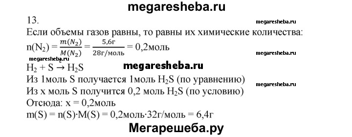 13. Рассчитайте массу серы, которая должна вступить в реакцию с водородом, чтобы образовался сероводород объемом, равным объему 5,6 г азота N2 (н. у.).
