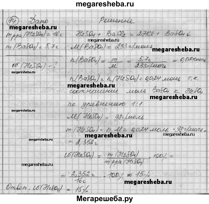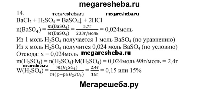 14. При взаимодействии 16 г раствора серной кислоты с избытком раствора хлорида бария образовалось 5,7 г осадка. Рассчитайте массовую долю серной кислоты в растворе.