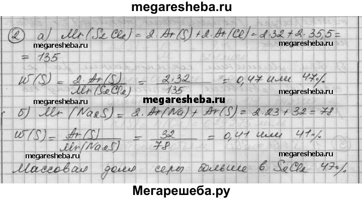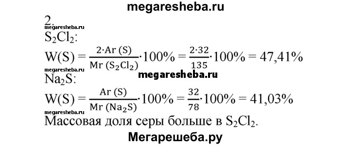 2. Рассчитайте, где больше массовая доля серы: а) в хлориде серы S2Cl2, используемом в резиновой промышленности в качестве растворителя серы; б) в сульфиде натрия, используемом при производстве красителей.