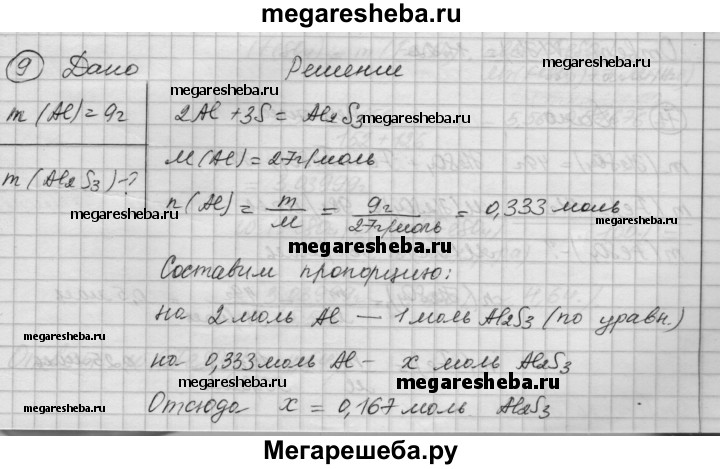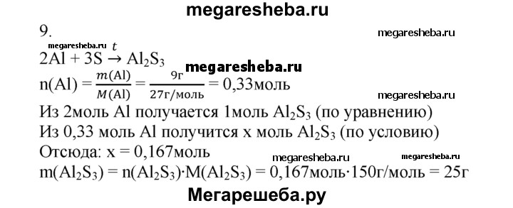 9. Смесь, состоящую из 9 г порошкообразного алюминия и серы, прокалили без доступа воздуха. Вычислите массу образовавшейся соли.