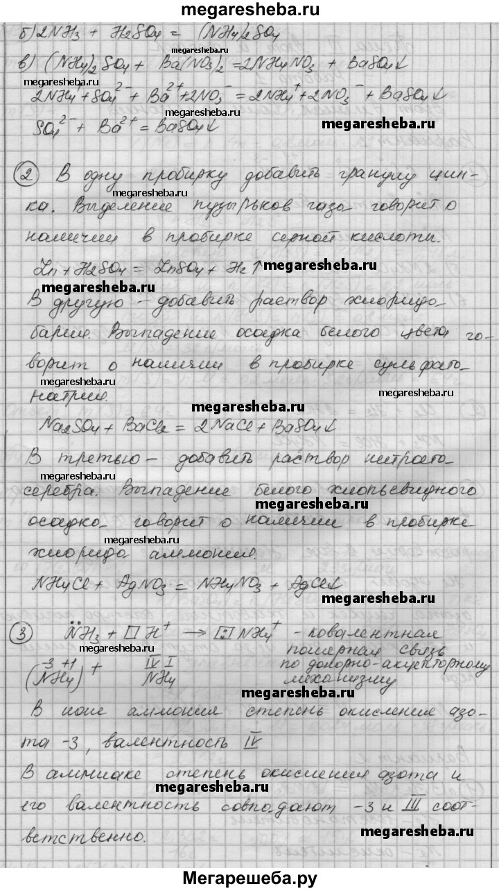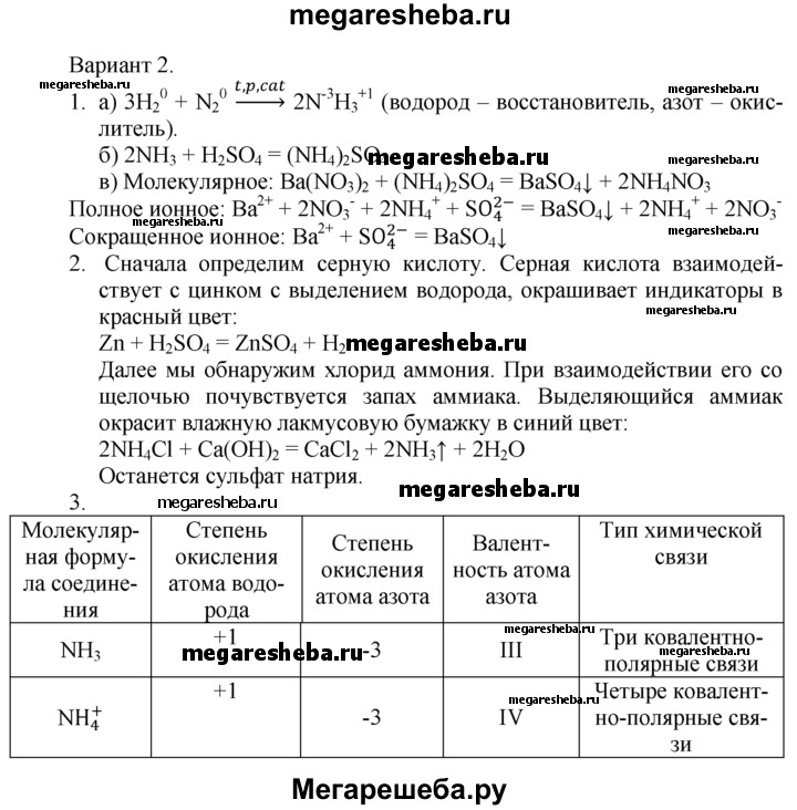 Вариант 2 1. Напишите уравнения реакций: а) азота с водородом (обозначьте степени окисления элементов и укажите окислитель и восстановитель); б) аммиака с раствором серной кислоты; в) раствора сульфата аммония с раствором нитрата бария (в молекулярной и ионной формах). 2. В трех пронумерованных пробирках находятся растворы серной кислоты, сульфата натрия и хлорида аммония. Как их можно распознать? Напишите уравнения соответствующих реакций. 3. Изобразите схему образования иона аммония. Укажите вид химической связи между атомами водорода и азота, степень окисления и валентность азота в аммиаке и ионе аммония.