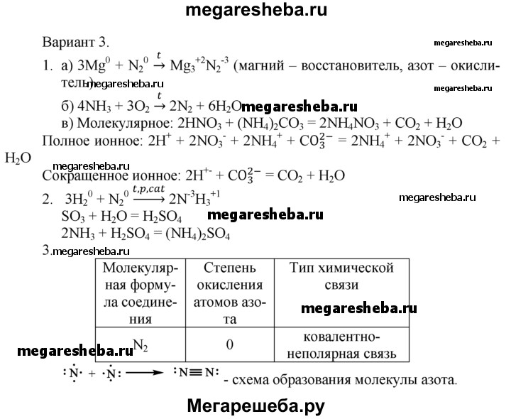 Вариант 3 1. Напишите уравнения реакций: а) азота с магнием (обозначьте степени окисления элементов и укажите окислитель и восстановитель); б) горения аммиака в кислороде; в) раствора карбоната аммония с раствором азотной кислоты (в молекулярной и ионной формах). 2. Как, исходя из азота, водорода, оксида серы(Vl) и воды, получить сульфат аммония? Напишите уравнения соответствующих реакций. 3. Изобразите схему образования молекулы азота. Укажите вид химической связи между атомами азота и их степень окисления.