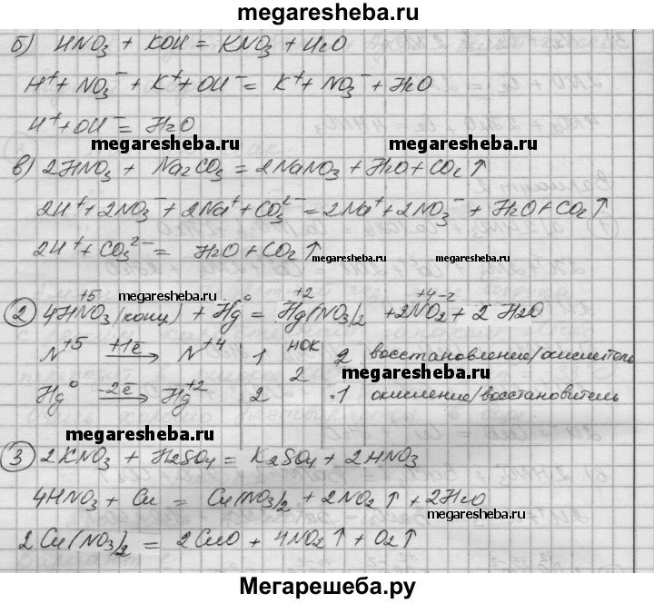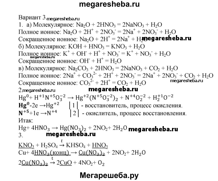 Вариант 3 1. Напишите молекулярные и ионные уравнения реакций между раствором азотной кислоты и: а) оксидом натрия; б) гидроксидом калия; в) карбонатом натрия. 2. Составьте уравнение реакции концентрированной азотной кислоты с ртутью. Укажите степени окисления элементов и расставьте коэффициенты с помощью метода электронного баланса. 3. Напишите уравнения реакций, с помощью которых можно осуществить следующие превращения: KNO3 -> HNO3 —> Cu(NO3)2 —> NO2