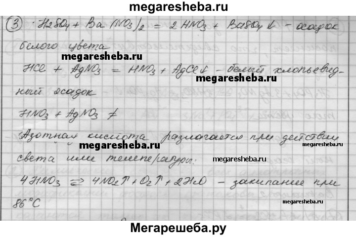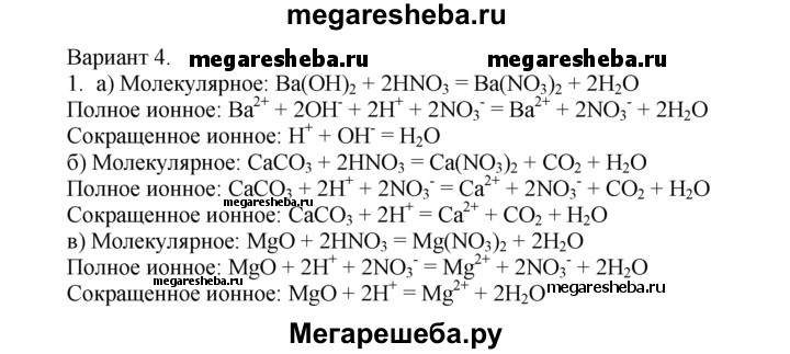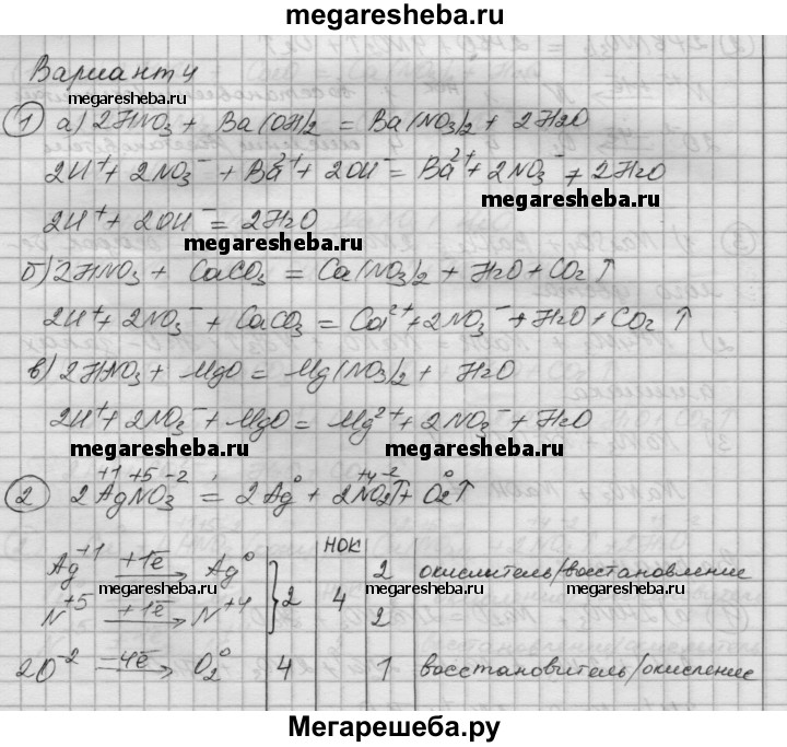 Вариант 4 1. Напишите молекулярные и ионные уравнения реакций между раствором азотной кислоты и: а) гидроксидом бария; б) карбонатом кальция; в) оксидом магния. 2. Напишите уравнение реакции разложения нитрата серебра при нагревании. Укажите степени окисления элементов и расставьте коэффициенты с помощью метода электронного баланса. 3. В трех пронумерованных пробирках находятся растворы серной, азотной и соляной кислот. Как их можно распознать? Напишите уравнения соответствующих реакций.