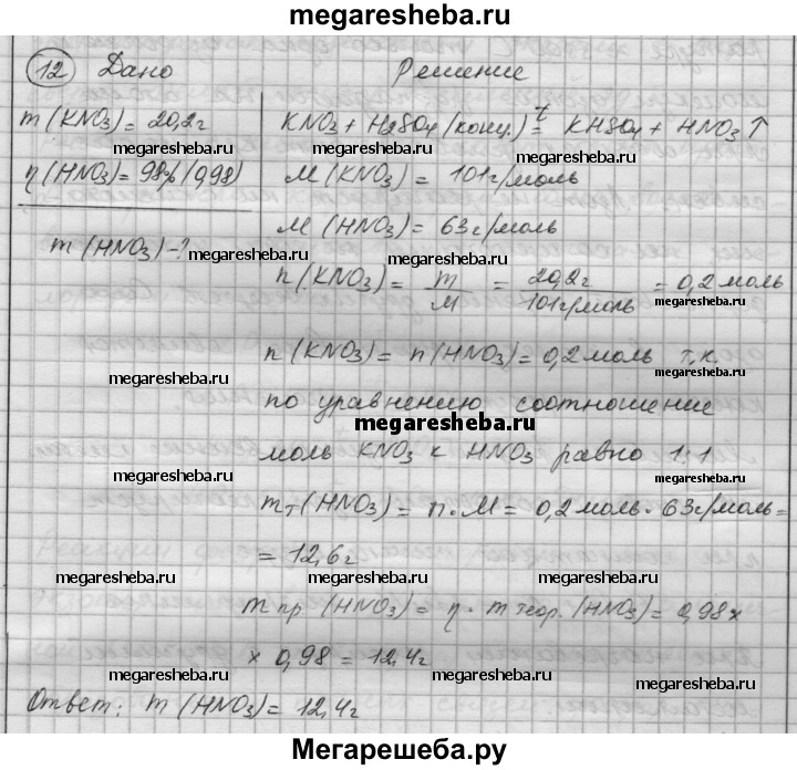 12. Вычислите массу азотной кислоты, которую можно получить из 20,2 г нитрата калия при его взаимодействии с концентрированной серной кислотой, если массовая доля выхода азотной кислоты составляет 98%.
