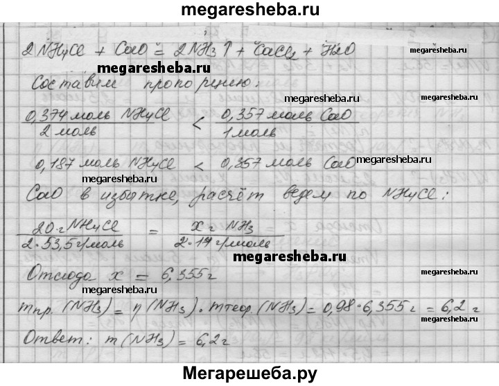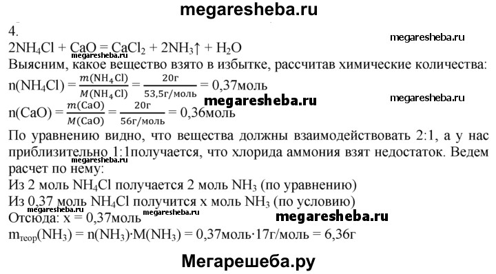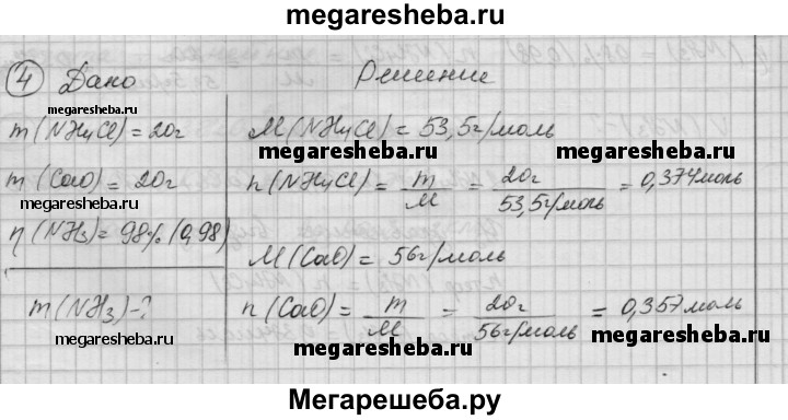4. Рассчитайте массу аммиака, который можно получить, нагревая смесь 20 г хлорида аммония и 20 г оксида кальция, Приняв, что массовая доля выхода аммиака составляет 98%.