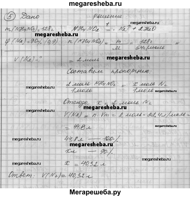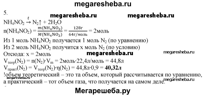 5. При нагревании нитрита аммония NH4N02 образуются азот и вода. Вычислите объем азота (н. у.), который можно получить при разложении 128 г нитрита аммония, если объемная доля выхода азота составляет 90%.