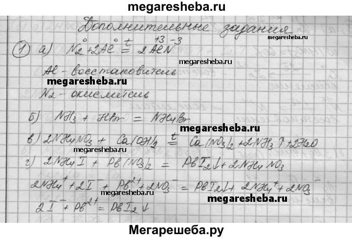 1. Напишите уравнения реакций: а) азота с алюминием (обозначьте степени окисления элементов и укажите окислитель и восстановитель); б) аммиака с бромистым водородом; в) нитрата аммония с гидроксидом кальция при нагревании; г) раствора иодида аммония с раствором нитрата свинца (в молекулярной и ионной формах).