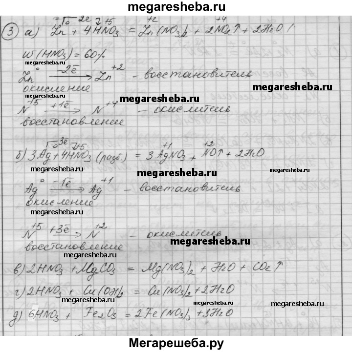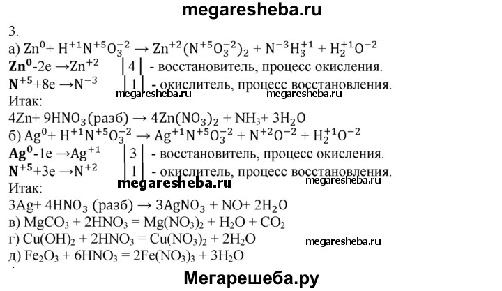 3. Напишите уравнения реакций разбавленной азотной кислоты: а) с цинком; б) с серебром; в) с карбонатом магния; г) с гидроксидом меди(ll); д) с оксидом железа(lll). Реакции а и б рассмотрите как окислительно-восстановительные.