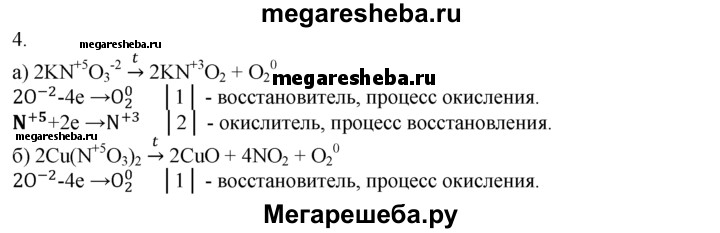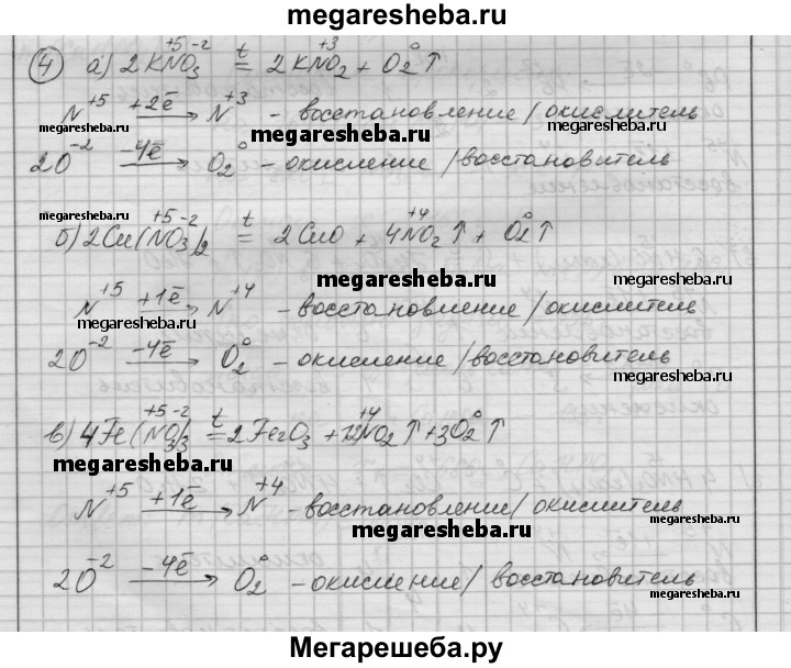 4. Напишите уравнения реакций разложения: а) нитрата калия; б) нитрата меди(ll); в) нитрата железа(lll). Рассмотрите эти реакции как окислительно-восстановительные.