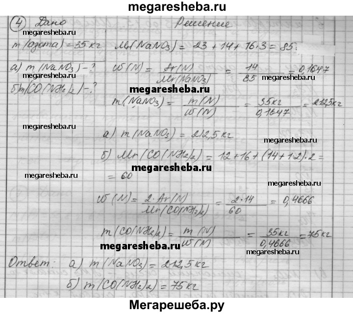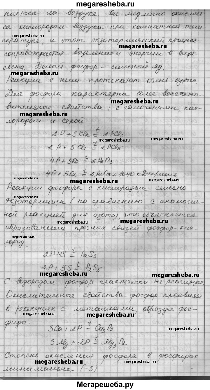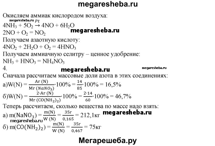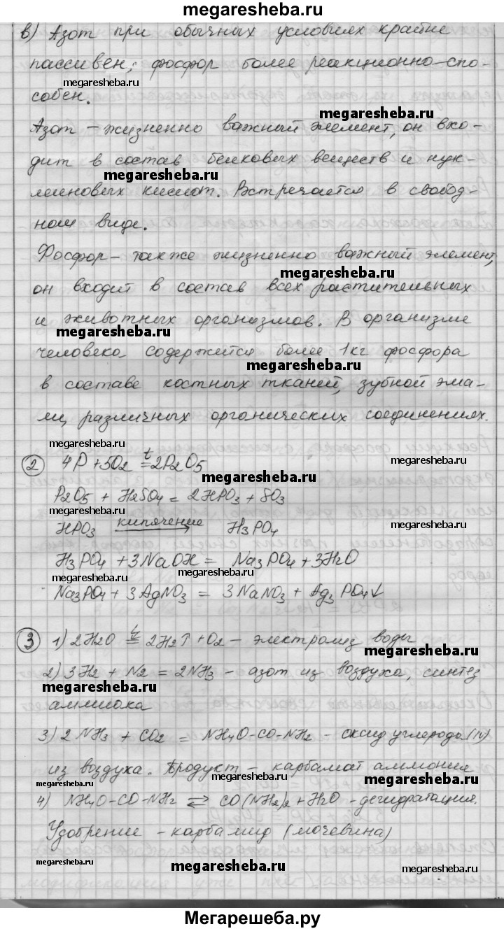 1. Дайте сравнительную характеристику молекулярного азота и белого фосфора. Укажите сходство и различие: а) в агрегатном состоянии; б) в химических свойствах; в) в реакционной способности и действии на организм человека. Ответ подтвердите уравнениями реакций. 2. Напишите уравнения реакций, с помощью которых можно осуществить следующие превращения: Р —> Р2O5 —> НРO3 —> Н3РO4 —> Na3PO4 -> Ag3PO4 3. Как, имея в качестве сырья только воздух и воду, можно получить ценное азотное удобрение? Составьте уравнения необходимых реакций. 4. В почву необходимо внести 35 кг связанного азота. Рассчитайте массу чистой соли: а) натриевой селитры; б) мочевины CO(NH2)2, которая потребовалась для этих целей.