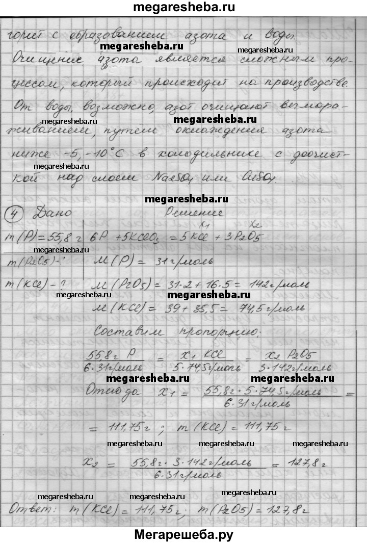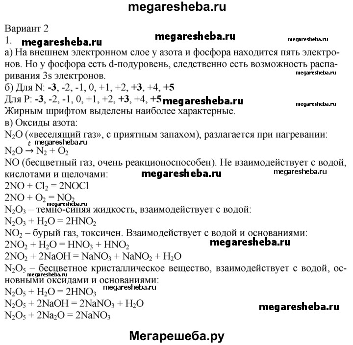 Вариант 2 1. Дайте сравнительную характеристику элементов азота и фосфора. Укажите сходство и различие: а) в строении атомов; б) в важнейших степенях окисления; в) в составе и свойствах образуемых ими оксидов. Ответ подтвердите уравнениями реакций. 2. Напишите уравнения реакций, с помощью которых можно осуществить следующие превращения: N2 —> NH3 —> NO -> NO2 —> HNO3 —> Ba(NO3)2 3. Как очистить азот от примесей: а) аммиака; б) паров воды? Дайте обоснованный ответ. 4. В реакцию с бертоллетовой солью вступил фосфор массой 55,8 г. Рассчитайте массы продуктов этой реакции.
