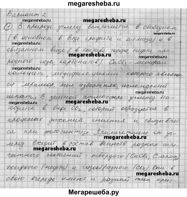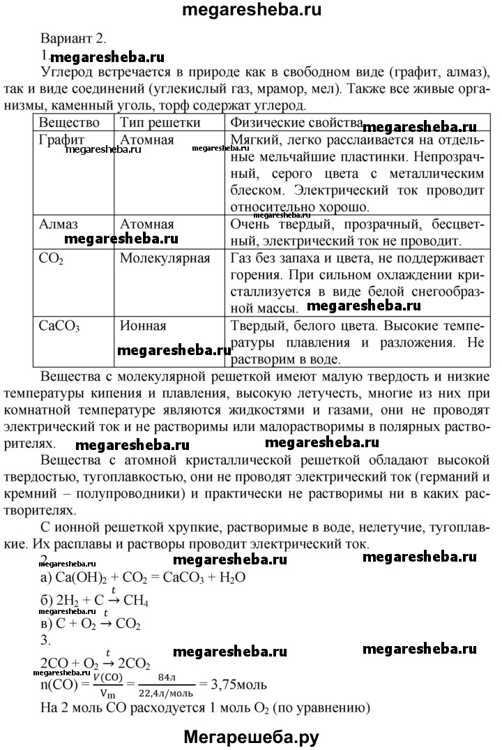 Вариант 2 1. В виде каких простых веществ углерод встречается в природе? Сравните их физические свойства. Объясните зависимость физических свойств от структуры кристаллической решетки. 2. Напишите уравнения реакций: а) оксида углерода(lV) с известковой водой; б) углерода с водородом; в) горения углерода в избытке кислорода. 3. Какой объем воздуха (н. у.) расходуется при полном сгорании 84 л оксида углерода(ll)? Объемная доля кислорода в воздухе составляет 21 %.