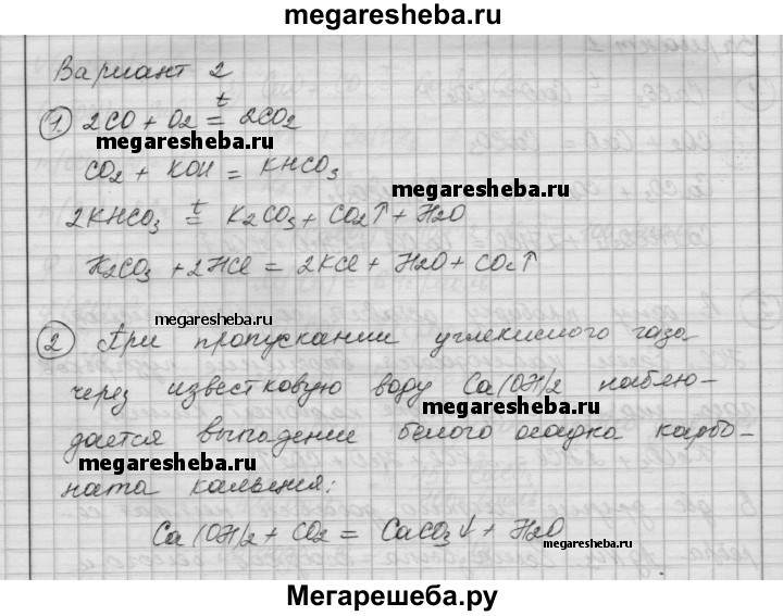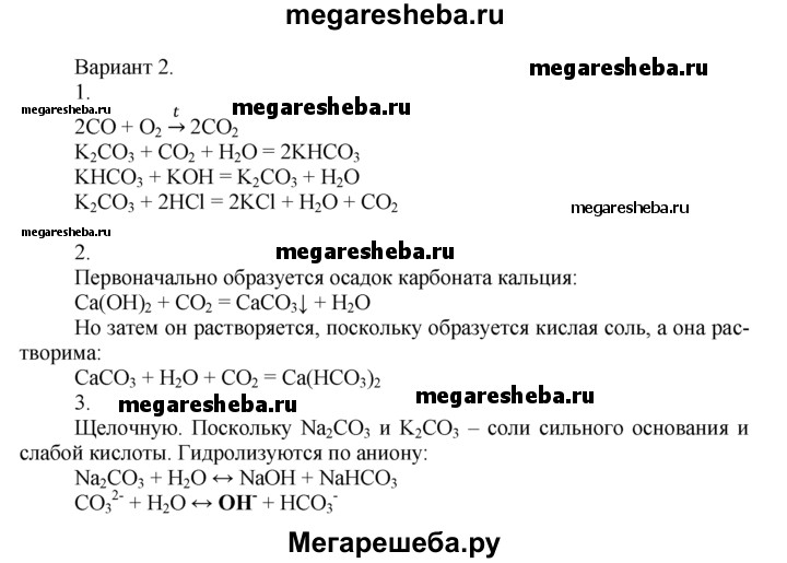 Вариант 2 1. Напишите уравнения реакций, с помощью которых можно осуществить следующие превращения: СО —> CO2 —> KHCO3 —> K2CO3 —> CO2 2. Какие изменения наблюдаются при длительном пропускании углекислого газа через известковую воду? Напишите уравнения соответствующих реакций. 3. Какую среду имеют водные растворы карбонатов натрия и калия? Почему?
