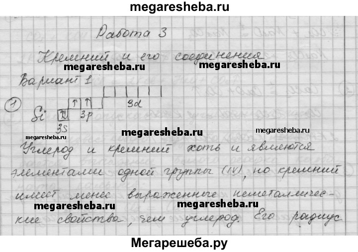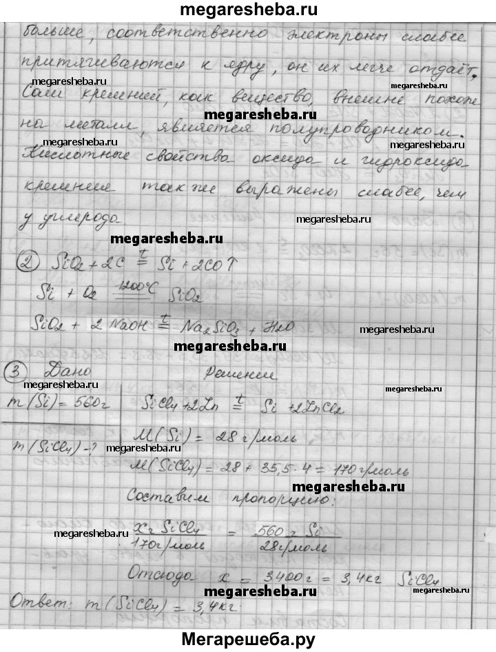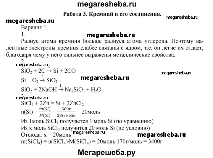 Вариант 1 1. Исходя из строения атома кремния, объясните, почему неметаллические свойства у кремния выражены слабее, чем у углерода. 2. Напишите уравнения реакций, с помощью которых можно осуществить следующие превращения: SiO2 —> Si —> SiO2 —> Na2SiO3 3. Кремний высокой чистоты получают восстановлением SiCl4 парами цинка при высокой температуре. При этом образуются кремний и хлорид цинка. Составьте уравнение этой реакции и рассчитайте массу SiCl4, который должен прореагировать с цинком, чтобы образовалось 560 г кремния.