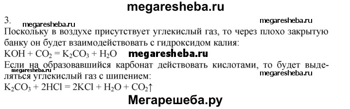 3. При длительном хранении гранул твердого гидроксида калия в плохо закрытых банках он превращается в белую порошкообразную массу. Если затем прилить к ней кислоты (серной, азотной или соляной), то с шипением выделяется газ, в котором гаснет горящая лучинка. Объясните описанные явления и составьте уравнения протекающих реакций.