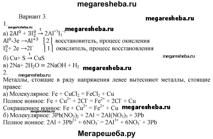 Вариант 3 1. Составьте уравнения реакций: а) алюминия с иодом; б) меди с серой; в) натрия с водой. В уравнении реакции а укажите степени окисления элементов и расставьте коэффициенты с помощью электронного баланса. 2. Укажите, между какими веществами произойдут химические реакции: а) железо и раствор хлорида меди(ll); б) серебро и раствор бромида кальция; в) алюминий и раствор нитрата свинца(ll). Напишите уравнения соответствующих реакций в молекулярной и сокращенной ионной формах.